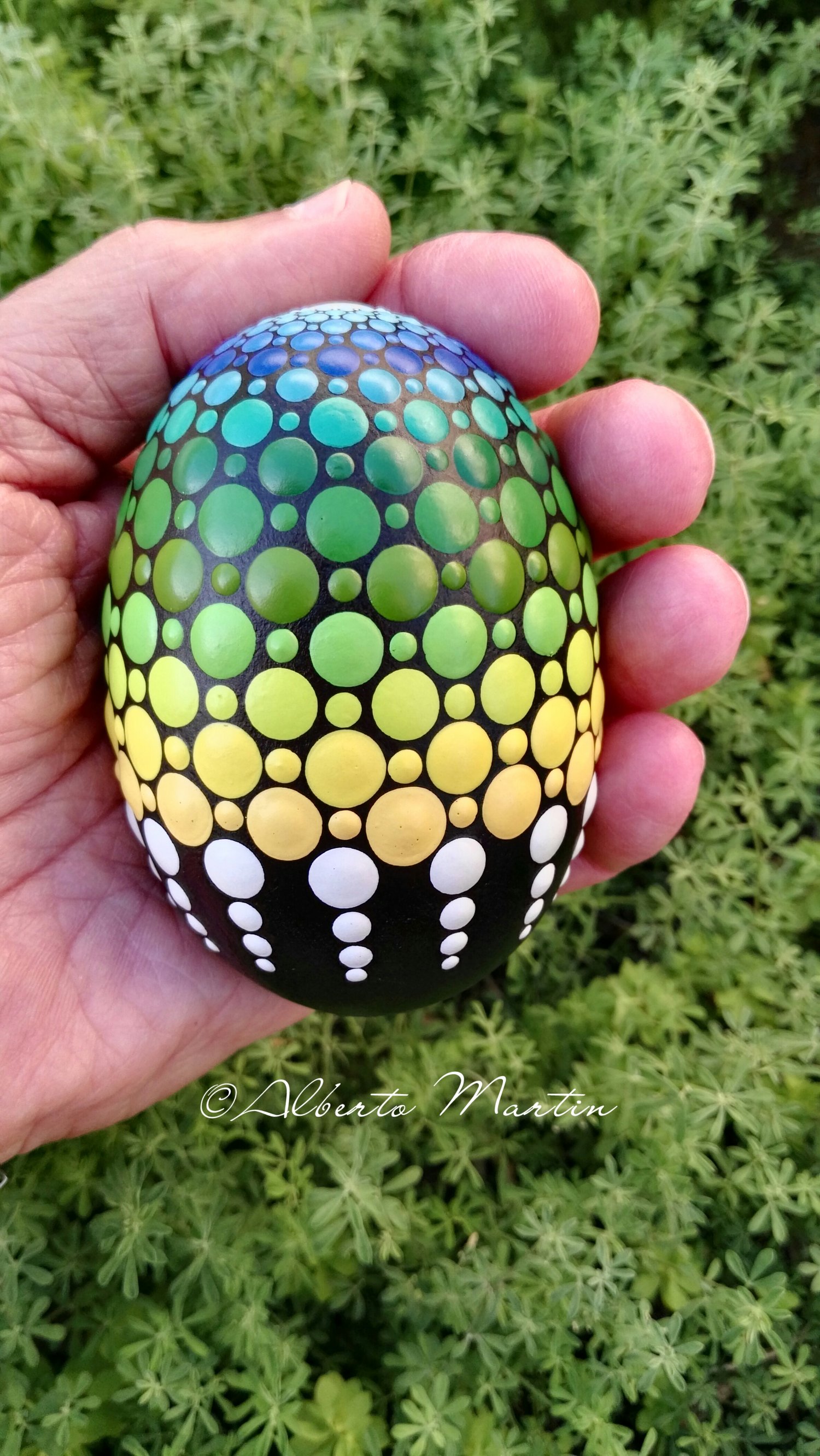 The painting is applied on a very special beach stone (egg shaped stone), using bright colors of acrylic paint with different tips sizes, patience and creativity, and given a spray of satine clear varnish (lead free) to prevent the paint from peeling (Acrylic paint is water soluble).